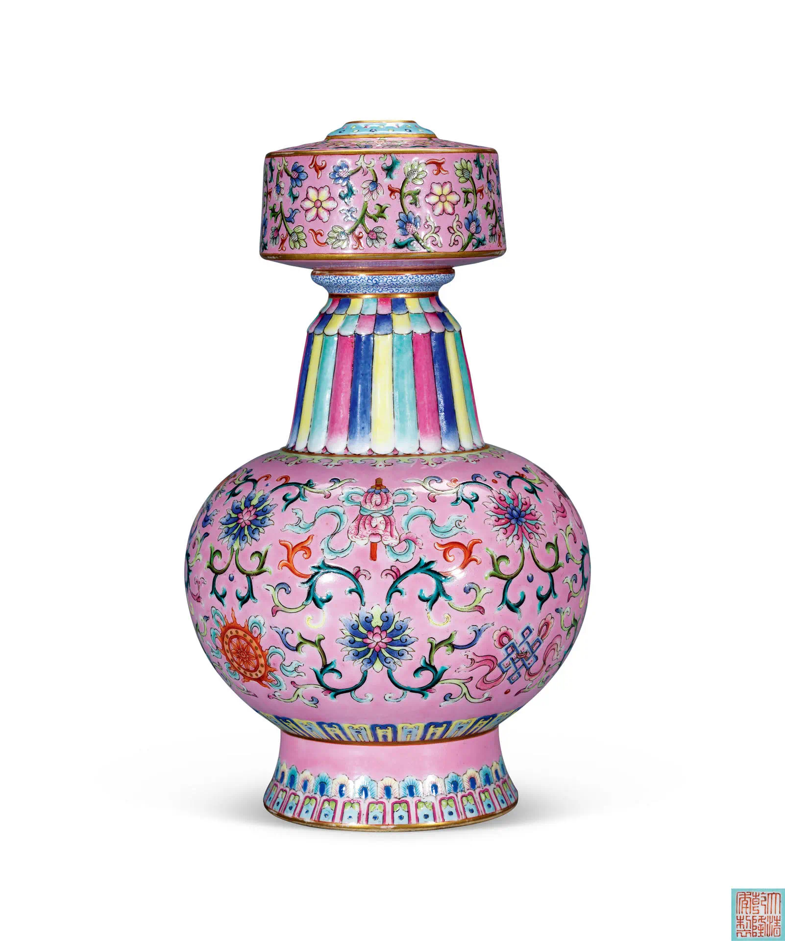清乾隆 宮粉地洋彩纏枝蓮?fù)邪藢毤y賁八瓶